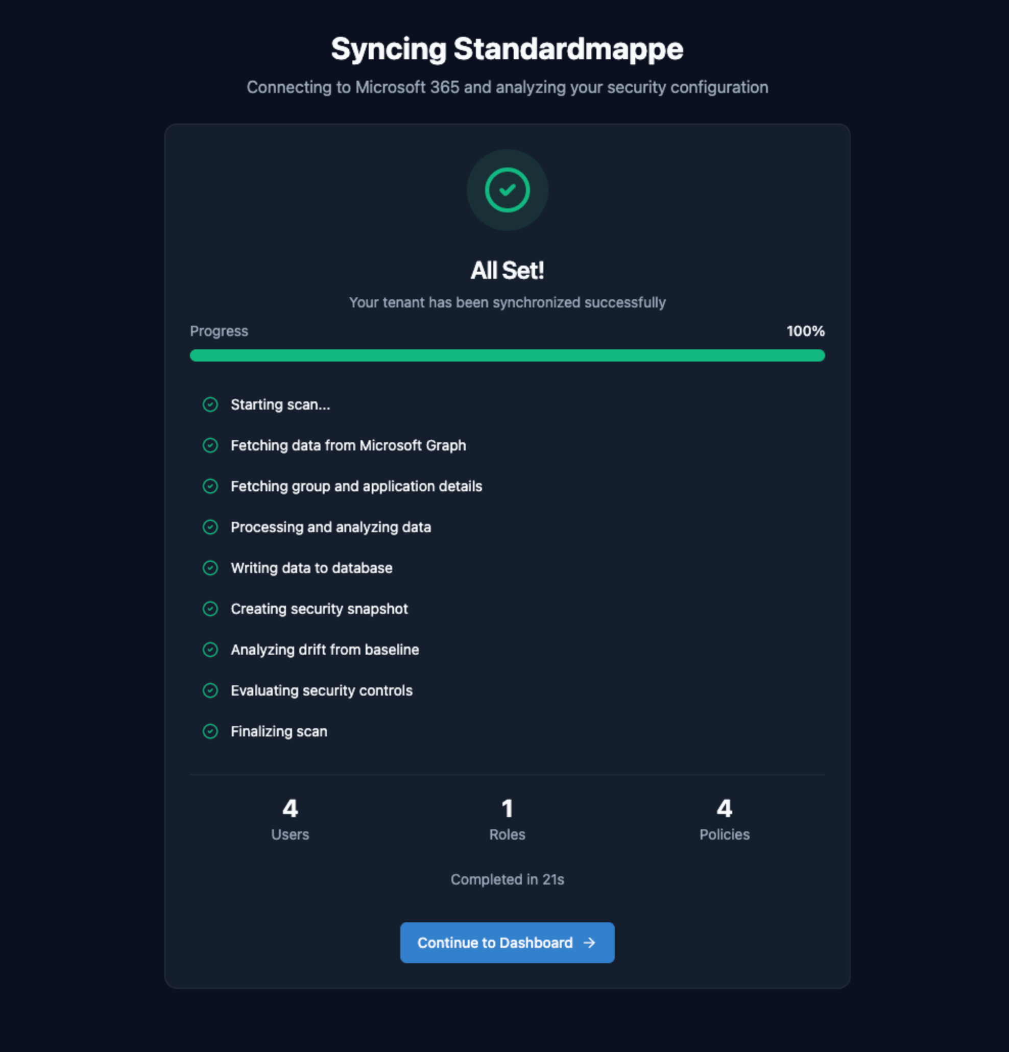 Each scan executes 8 phases to collect data from Microsoft Graph API, normalize it into scan tables, and evaluate your baseline controls. Understanding these phases helps you troubleshoot issues and optimize scan performance.