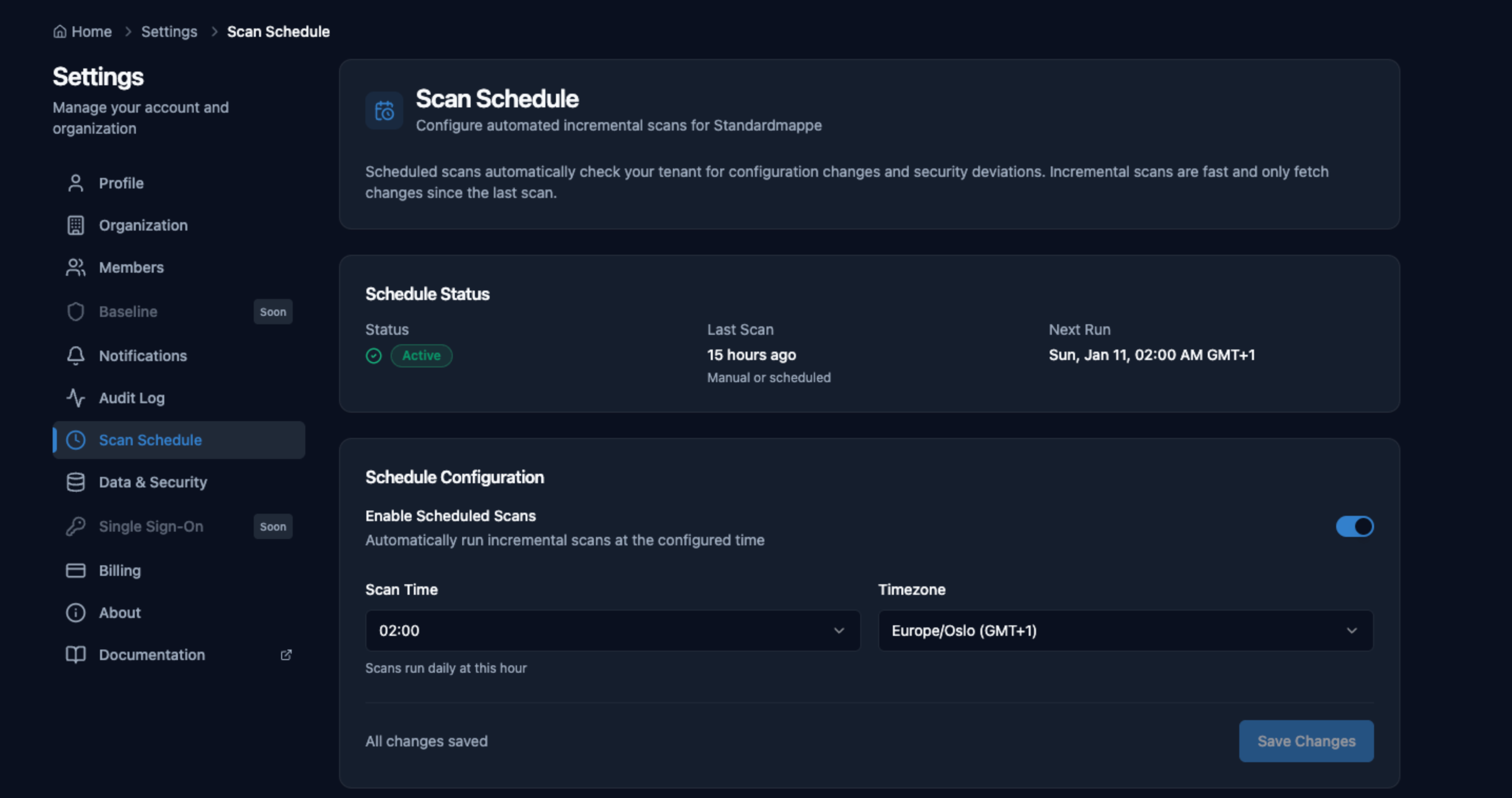 Choose a scan frequency that balances security visibility with API quota consumption. Most organizations use daily scans, with critical tenants on hourly schedules.